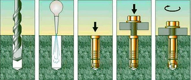 Анкеры устанавливаются в отверстия, протягиваются посредством ключа. Качество фиксации крепежа проверяется вручную.