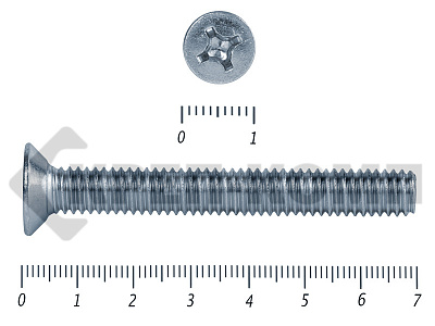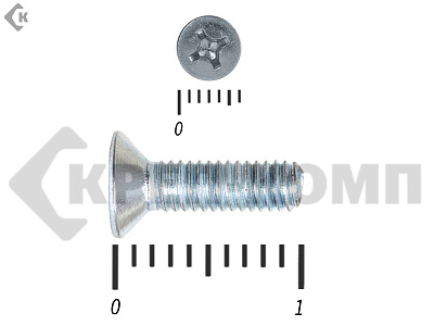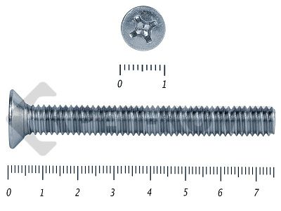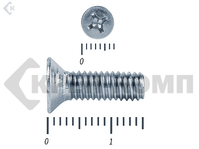 Винт с потайной головкой DIN 965, (ГОСТ 17475), оцинкованный, класс прочности 5.8. Шляпка при монтаже глубоко утапливается в материале и не выпирает наружу. Винт DIN 965 с потайной головкой с крестообразным шлицем и полной резьбой (метрической стандартного шага, нарезанной по всей длине шпильки). Винты DIN 965 используются в строительстве, машиностроении, промышленных и производственных отраслях совместно с шайбами, гайками соответствующих размеров